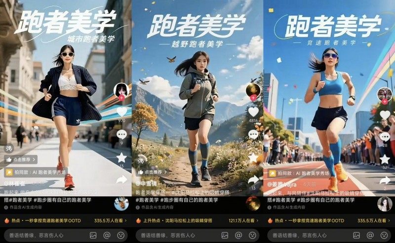 在抖音达人的带领下,抖音用户也可以通过“AI跑者美学秀场”特效滤镜,随手一拍就能AI换装,低门槛秀出不同风格的「跑者美学」穿搭,全民跟风体验,渗透「跑者美学」的大众心智。