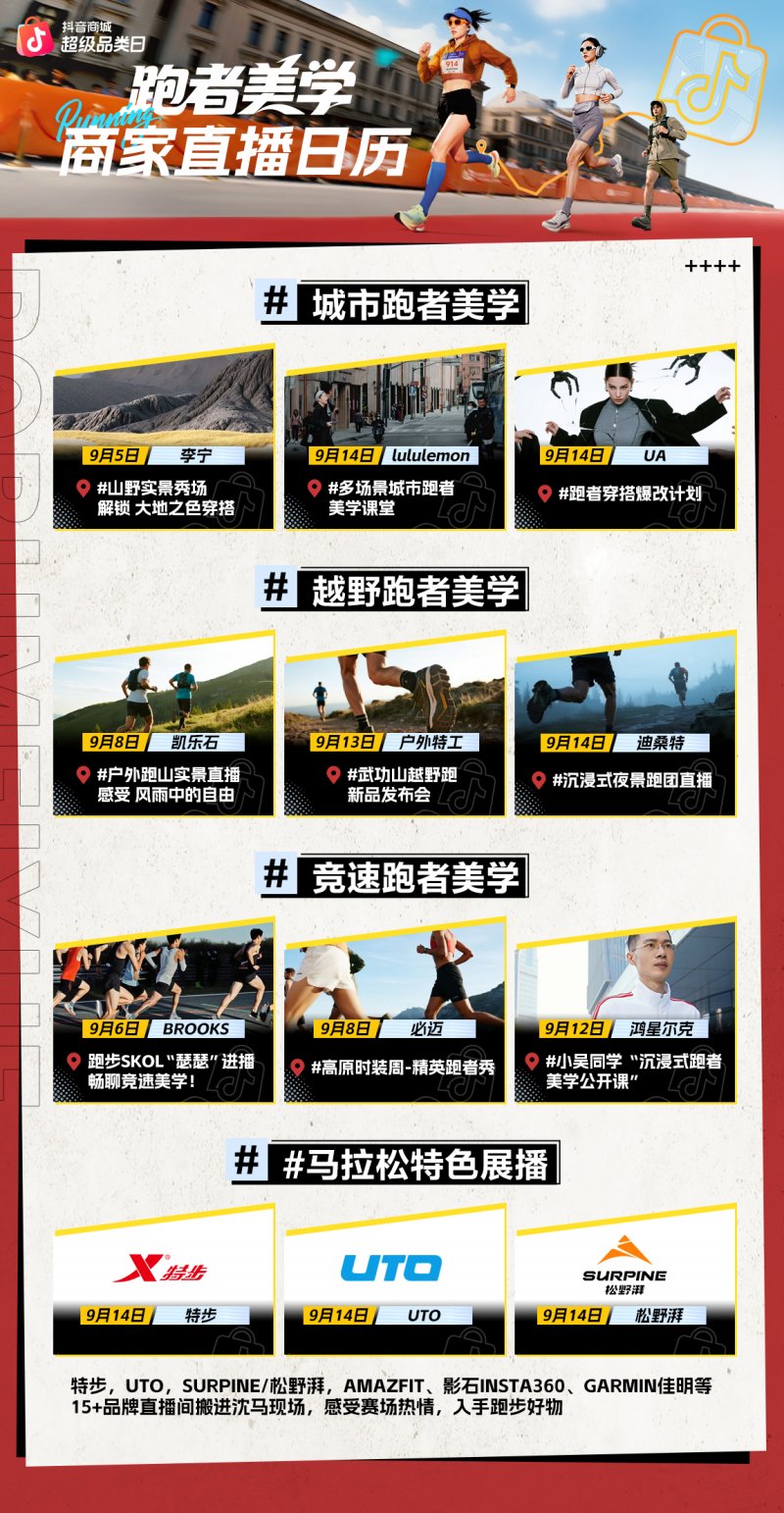 以跑鞋带动穿搭,跑者美学,跑得漂亮!9.4-9.16,抖音商城跑步季品类日,首次深度联合沈阳马拉松赛事,通过“爆改国内首个跑马终点赛道变红毯”、“跑者美学新趋势打造”、“跑者美学创新店播指南”等,带动赛事现场2万人漂亮跑马,获央视直播影响力扩散全网,助力跑步品类生意爆发。