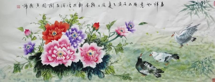 绿琼枝华诗情在,惠风拂花闪彩霞。能在花鸟画方面达到如此高的水平,奉献出如此令人惊艳的艺术作品,应该归于先生的悟性和灵才之气,先生全身心继承了传统花鸟的典范,丹青百家皆被先生深谙十分,其作品淋漓酣畅,画风大气秀丽,可以说是把花鸟的情态与精髓展现到了极致,欣赏其作时,总是不免令人感受到一股笔所未到韵已纯,紫霄缨络垂彩屏的艺术风趣,丹青大家,造极艺巅!