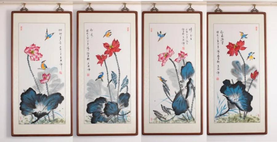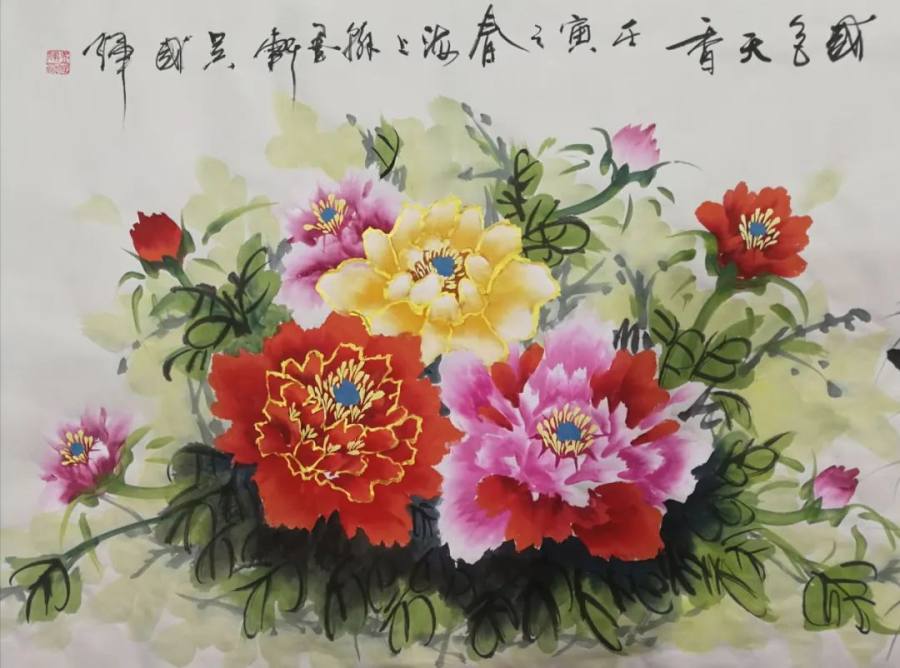 色彩在先生的作品中,亦是有着不可替代的位置。在用色上,先生创造艳丽形象的同时,还充分保持住了中国画的高雅格调,做到了色彩不因艳而显俗,他在北方画派偏用单纯色彩来补充墨色的特点上,加入了岭南派的艳丽色彩,两者进行了有机的结合,可以说是在用色上下足了功夫,在先生的色彩加持下,其花鸟焕然生新,前贤画花,总多以胭脂作花,花青为叶,色泽轻淡,以此显高雅之态,然先生却将其突破,在红中加白,尽显花朵亮丽夺目之势,叶子也掺以墨汁,如此既不失传统,又不失个人特质,从根本上讲,先生的色彩格调,是纯正的,更是独具匠心的。