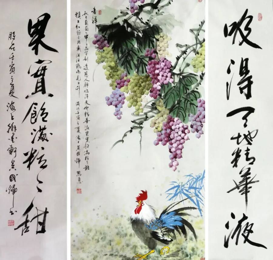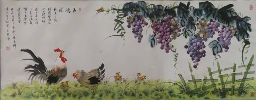 白石大师曾言,画花卉必须有虫鸟陪衬才更生动,纵览先生的花鸟之作,也正是如此,画中先生时常加入鸡禽鸟兽,以此来增添生动之意,而更令人拍案叫绝的,当属先生对牡丹枝干龙飞凤舞的穿插经营,同时这也是他人最难以模仿的地方,其作品无论是清秀荷花,还是春风紫藤,又或金秋瓜果,一一皆是巧用留白,画面简约而意远,整幅构图给人以强烈的精神感悟,处处见性情,更见意韵,众幅作品,花鸟虫禽,小景写真,虚与实,隐与显,动与静相互交织,协调如意,得心应手,暗自天成,画面的情景也因此得到了品质的升华!