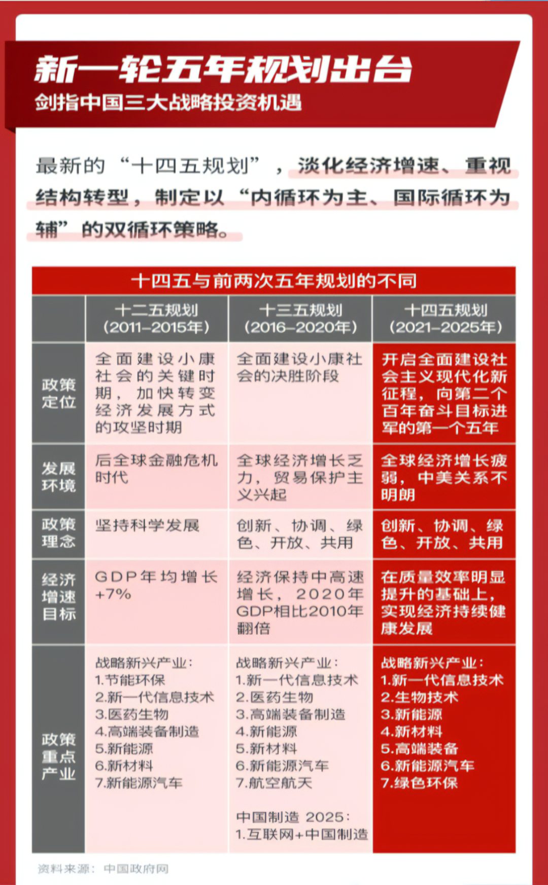 在十四五规划中,聚焦战略新兴产业,加快关键核心技术创新应用包含了新一代信息技术、生物技术、新能源、新材料、高端装备、新能源汽车、绿色环保、航空航天、海洋装备。并做大做强“生物经济”:推动生物技术和信息技术融合创新,加快发展生物医药、生物育种、生物材料、生物能源等产业,且深化北斗系统推广应用,推动北斗产业高质量发展。
