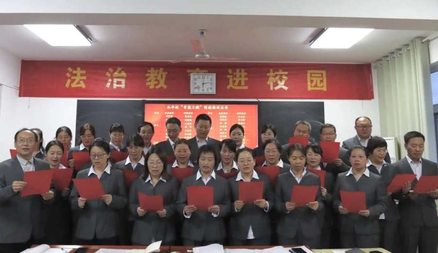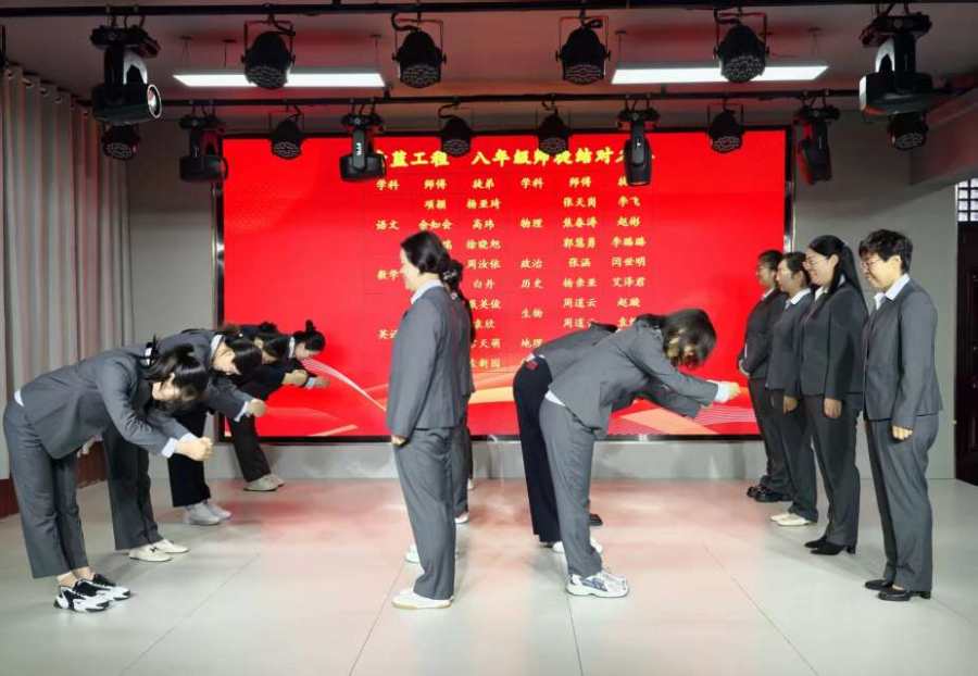 最令人动容的当属拜师鞠躬环节。徒弟们怀着敬意,向师傅深深鞠躬。这一礼,是对师傅经验与付出的尊重,更是一份“风雨同舟、携手成长”的约定。自此,师徒二人将在教育路上并肩前行,共同见证彼此的每一次进步、每一份收获。随后,全体师徒庄严宣誓,铿锵有力的誓言回荡在会场,既展现了骨干教师无私奉献、助力青年教师成长的崇高境界,也彰显了青年教师扎根教育、不负重托的坚定决心。