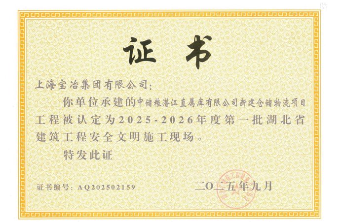 近日,从湖北省建设工程质量安全协会传来喜讯,由上海宝冶集团有限公司承建的中储粮潜江直属库有限公司新建仓储物流项目,凭借其高标准的安全管理、绿色文明的施工实践,成功获评“2025~2026年度第一批湖北省建筑工程安全文明施工现场”。