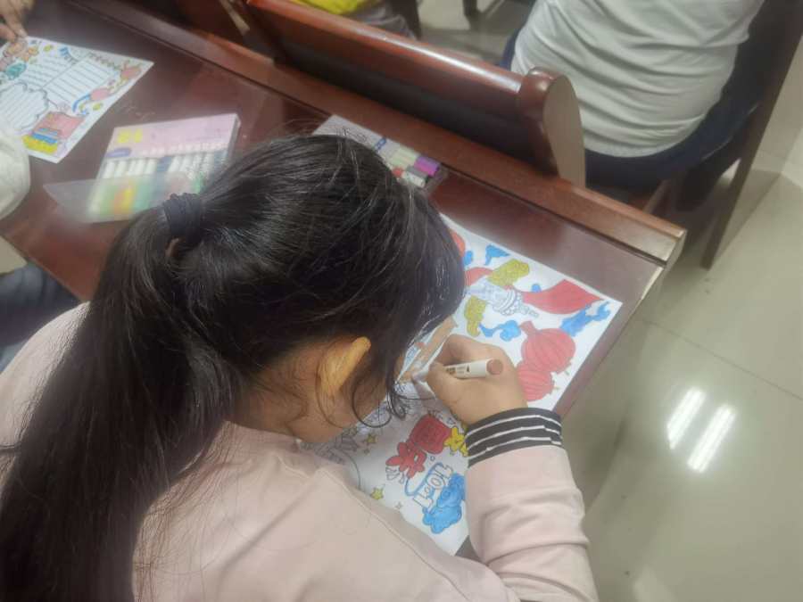 活动开场,社工以“知识问答”结合视频,讲解国庆节来历。大屏幕播放开国大典历程的短片,天安门城楼的庄严场景、飘扬的五星红旗,为孩子们搭建历史认知框架。接着社工又提问了一些包括建国日期和国歌名字等问题让孩子们回答,一问一答间,爱国种子在孩子心中扎根。接着孩子们进行涂色创作,每个孩子发一张关于国庆的黑白线稿,孩子们用画笔描绘着祖国的壮丽山河,经过半个小时的创作一幅幅精美图画呈现出来。