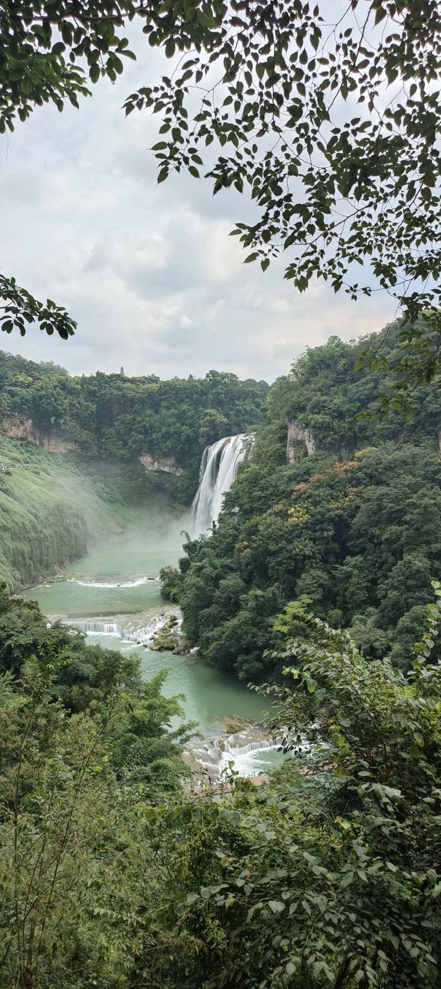 我们挤在人流里,一步步挪动着往前走。也不知走了多久,忽然看见前边很多游客的手臂指向同一个方向,我的第一反应——看到大瀑布了。果然,顺着大家手指的方向,在路边绿树的枝叶掩映之下,远远的,看到了黄果树瀑布的侧影,仿佛是挂在天幕上的一幅画,静止在那里,供游客们搔首弄姿摆拍。