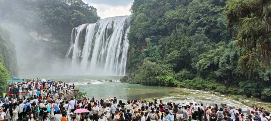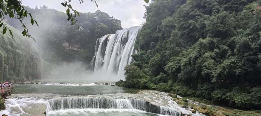 随着台阶下到最底部,我们终于挤到了大瀑布的正前方。瀑布的正前方是一个足以容纳几千人的大观景台,观景台的边上是栏杆,若不是有栏杆,该有上百人跌落深潭与大瀑布共舞了。站在观景台上,面对大瀑布,感觉它有一百米以上的宽度,高度也应该在八十米左右。如果能有幸提前预约到票,还可以走到大瀑布水体的背后去体验孙猴子钻入水帘洞的感觉。看景区介绍上说在另一个观景点还可以从高于瀑布的位置遥看大瀑布的水是从哪儿流过来的。除了经典的主瀑布,黄果树瀑布还有十几个分瀑,集中在该区域成为一个巨大的瀑布群,“中国第一瀑”果然名不虚传啊!