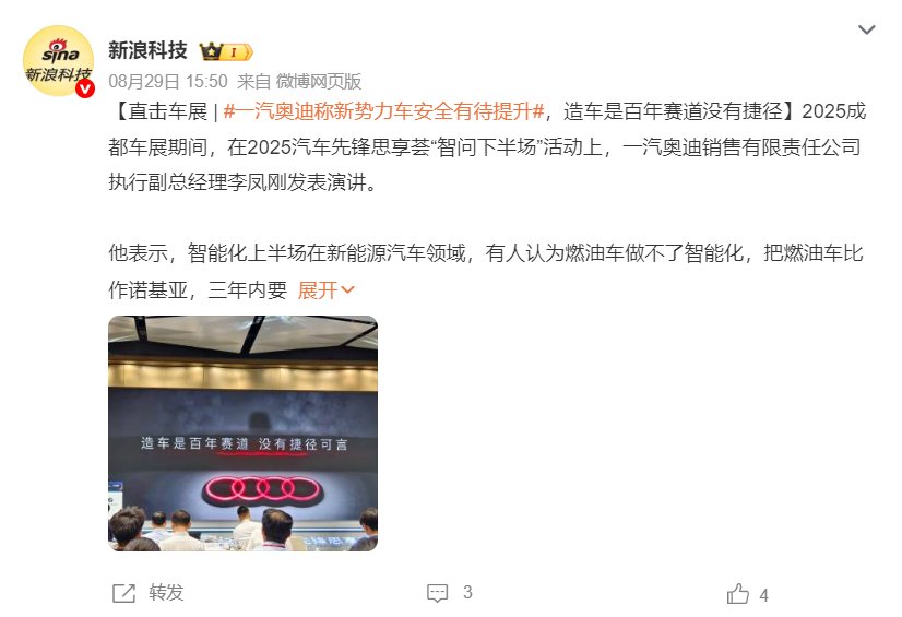值得一提的是,2025成都车展期间,在2025汽车先锋思享荟“智问下半场”活动上,一汽奥迪执行副总经理李凤刚曾指出,“新势力和传统车企造车各有优势,传统车企造的车安全可靠,劣势是创新不足;新势力造的车更有智能乐趣,但在安全可靠上还有待提升”。
