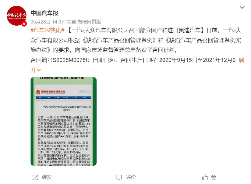 5月,因组合仪表软件问题,一汽大众召回近13.4万辆奥迪汽车,其中国产A6L占比达到75.34%。