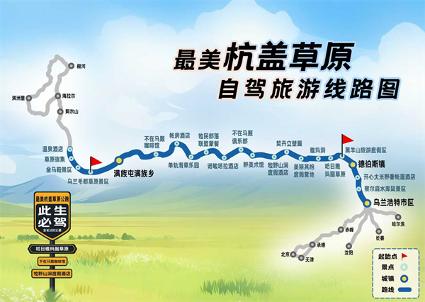 中国最美杭盖草原自驾旅游线路,自内蒙古兴安盟科尔沁右翼前旗黑羊山旅游度假区东门起始,沿着草原公路一路向前,途径哈日雅马图山神庙、契丹文壁画遗址、哈日雅马图草原、雅玛洞、牧野山涧度假酒店、野美术馆、不在马厩俱乐部、诺敏塔拉酒店、牧民部落联盟蒙餐、不在马厩咖啡馆、帐房酒店、单轨滑草乐园,至乌兰毛都草原景区、金马鞍景区、草原宿集、温泉酒店等区域为止,全程100多公里。