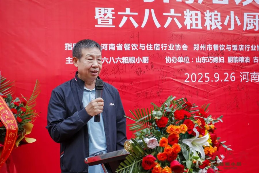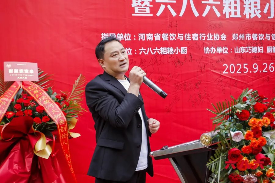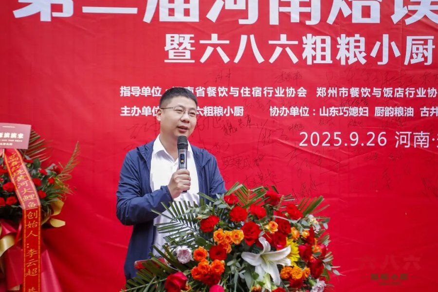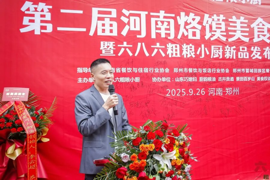 六八六粗粮小厨品牌创始人赵天军在致辞中回顾首届烙馍文化节的热烈场景,感恩行业与消费者的支持:“这份厚爱让‘六八六’扎根河南粗粮美食的初心得到肯定,也让我们更坚定地扛起传承使命。” 他同步发布新品:“今年我们推出‘荆芥烙馍’,将河南特色食材荆芥与烙馍结合,让‘烙馍卷菜’更河南、更出彩;同时优化升级酱焖大鲤鱼、八宝烤南瓜等爆品,未来会持续深耕创新,推广烙馍文化,为健康饮食与河南餐饮高质量发展助力。”