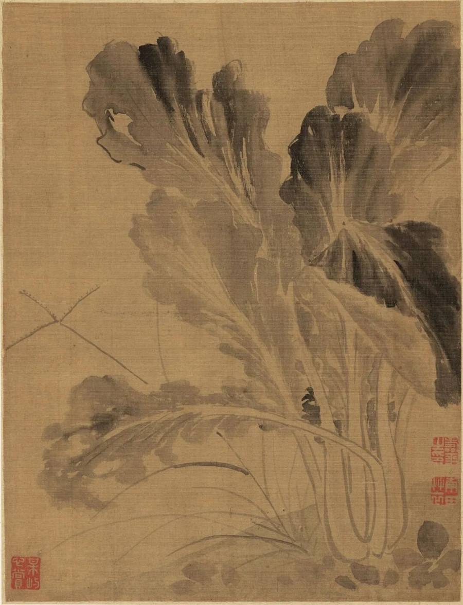 浓墨泼成大叶,轻烟铺开嫩茎。数丛并立,根节相依。叶面翻涛,边缘起伏如浪;中脉微寒,层层透入素绢。湿痕漫涧,光气浮生;淡区开净,气口通明。全幅偏左取势,右隅留空纳风,园畦午寂,泥香微起,野蔬清姿自来。
