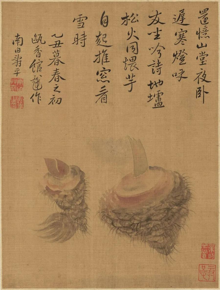 素绢开卷,题札横云,上方清响如吟。下部双芋并置,一端萌芽直起,嫩绿如笋;圆壳层层,晕若霞腴;须根四散,状类雪鬣。空处宽明,烟气似生,寒室微灯在侧,炉火未见而温意自来。取家蔬入画,去雕去饰,气象沈静,格度端醇。