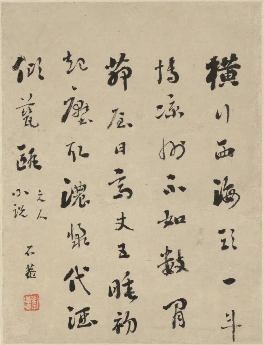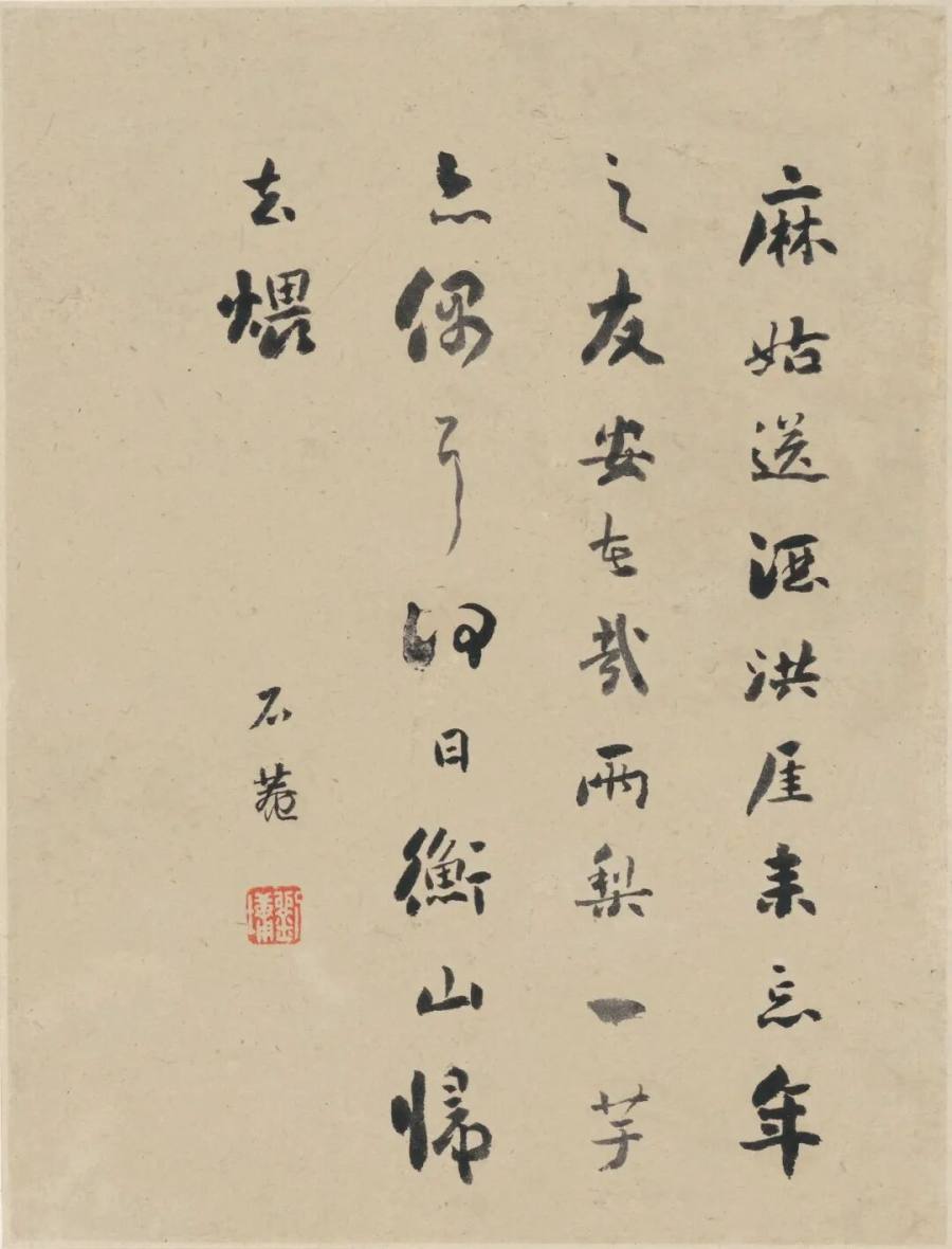 石庵书法锋藏力透,浓墨如漆。点画沉着,起收谨严,转折圆畅,波磔含蓄。中锋主骨,侧意佐势,枯湿并调,浓淡互映。线条丰腴而不臃,劲健而不急,墨华层层渗入纸腔,气息温润。大开大合间,留白清朗,黑白对举,金石之气自来,典重风度满幅。