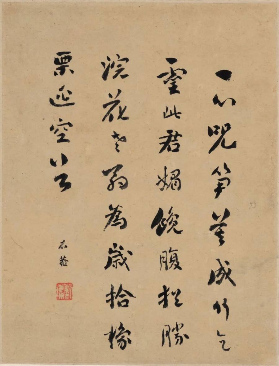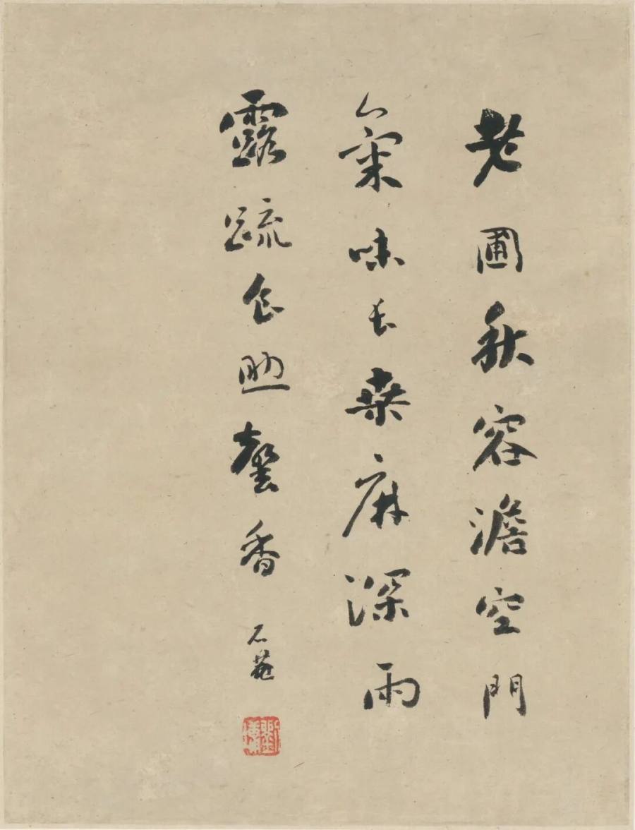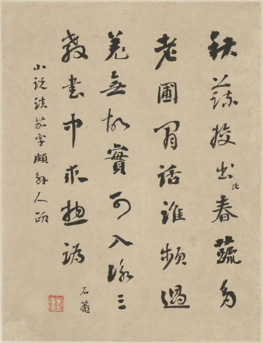 刘石庵对题挥翰。浓墨如漆,线丰气厚;起收谨严,转折圆畅;中宫收束,欹正相扶;章法疏密有次,行气贯通如云水。红印点位安稳,黑白对举,金石入骨。人称浓墨宰相,淡墨探花,书画并辉。南田清润,石庵雄浑,一柔一壮,相映成章;庭院静听,松火微温,卷中风神并作,千秋可传。笔下声息沉着,墨华层层渗纸,光影在行间回旋。展页再三,心定气平,观人自得清欢。室静灯暖,余韵不尽。可赏。