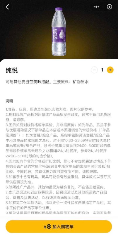近日,重庆、西安、上海等地消费者陆续吐槽麦当劳门店内纯悦瓶装水定价过高,同款产品在电商平台单瓶均价不足1.5元,而麦当劳门店售价却达7.5元至8元,价格差异超4倍,引发公众对餐饮场所商品定价合理性的讨论。