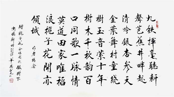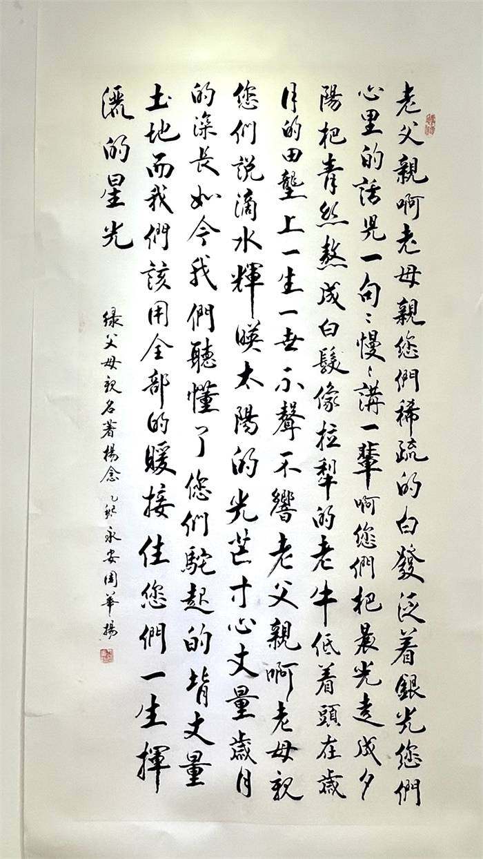 九旬老人周华扬的书法作品笔力沉雄,气韵流动,将乡土文化与现代审美融为一体,既传统又新颖,为书法创作打开了新的视野。是“新时代农民精神气质的鲜活写照”,既凝聚了乡土大地的质朴气息,也展现出乡村振兴中文化赋能的动人力量。他的作品扎根泥土,散发芬芳,既有大地的厚重,又有时代的清新。乡村振兴,既美在面貌,更贵在灵魂——他的墨迹,正是乡土灵魂的生动诠释。