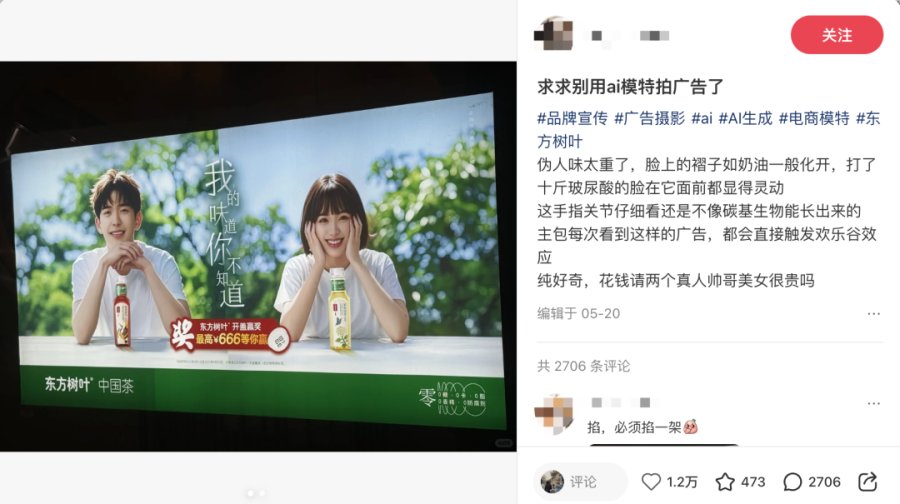 AI 并没有真正意义上解放人工,很多环节还是需要人去把关、修正甚至重做。在“人工精修”干预下,能很大程度上弱化AI广告的“伪人感”。