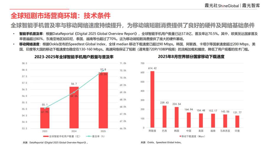 两项关键基础设施的成熟,为短剧出海按下“快进键”。其一,终端覆盖已无盲区:全球57.8亿智能手机用户(普及率约为70.5%)构成了“无孔不入”的放映网络,让“随时随地看剧”成为全球通用行为模式。其二,网络瓶颈已被击穿:90Mbps以上的全球中位数移动网速,意味着即便在人口大国,播放高清视频也无需缓冲。这不仅是技术升级,更是一场关乎消费心理的技术革命——用户不再容忍等待,而短剧恰好是提供“即时满足”的最佳载体。