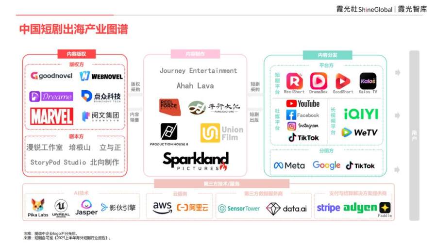 我国短剧生态的完整性与产业链的成熟度,已在全球范围内形成显著优势,并转化为规模化的内容生产能力。产业链上下游协作紧密:上游负责IP及制作,中游聚焦于分发及营销,其中,平台与版权方是价值核心。这种内在产业优势为中国短剧出海奠定了坚实基础。但另一方面,海外市场对中国短剧在合规、本地化等方面提出了更高要求,资金需求更大,由此进一步提升了行业门槛,强化了头部企业的领先地位。