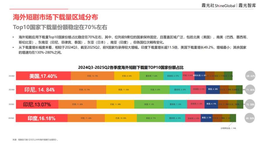 全球短剧应用下载量呈现出“核心稳定,增长澎湃”的态势。Top10国家牢牢占据约70%的市场份额,其中九个“强席位”固定,覆盖北美、拉美及东南亚等区域,显示出短剧市场的全球吸引力。而增长则是另一番景象:印度以超过11.5倍的惊人增速一骑绝尘,成为最强增长引擎;美国市场增幅虽小(49.2%),但体量庞大;其余各国增速均落在130%至280%区间,共同推动市场全面繁荣。