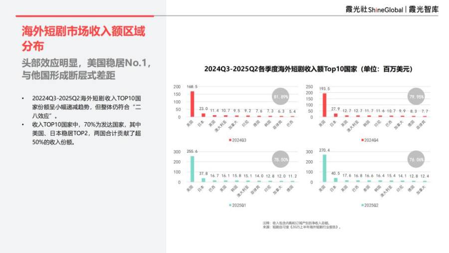 海外短剧的市场收入呈现出明显的“二八效应”,格局高度集中。尽管Top10国家的收入份额略有下滑,但仍牢牢占据全球市场收入大盘的八成以上。其中,美国与日本构成绝对核心,两国合计贡献了超50%的收入份额,展现出发达国家强劲的付费能力。