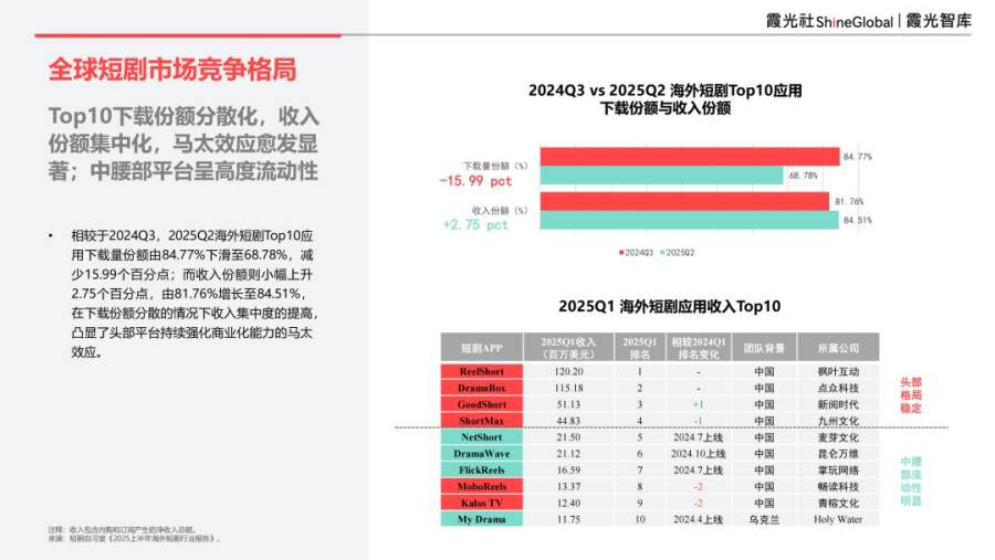 从市场份额变化来看,竞争格局正从“量”的扩张转向“质”的深耕。2025年第二季度,海外短剧Top10应用的下载量较2024年第三季度下降约16个百分点,至68.78%,表明流量入口正趋于分散,然而同期Top10平台的总收入份额却不降反升,小幅增长2.75个百分点至84.51%。上述“下载分散、收入集中”的趋势,凸显出头部平台在用户留存与商业化效率方面的优势正在持续强化,马太效应日益显著。