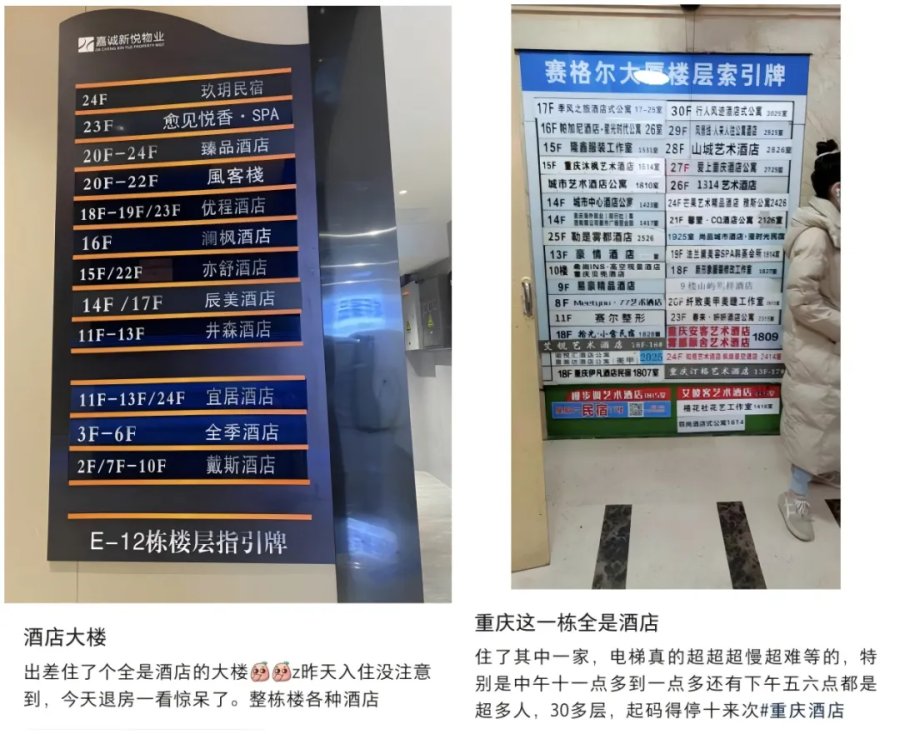楼层指示牌上密密麻麻列着不同酒店的名字和所在楼层,宛如一个“酒店垂直综合体”。