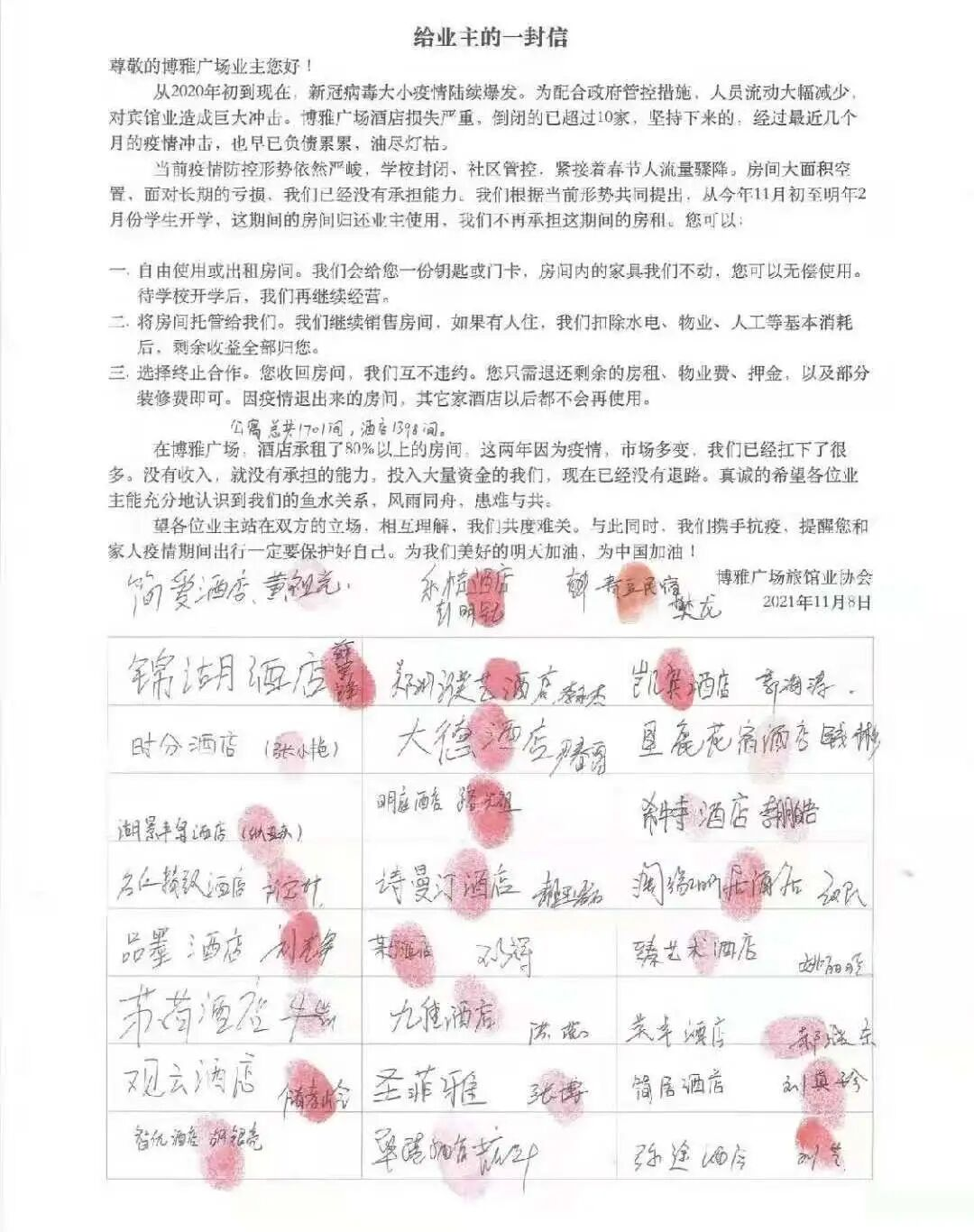 2021年,河南郑州数十家公寓旅馆老板组团向公寓房东施压,退租、退房、毁约。