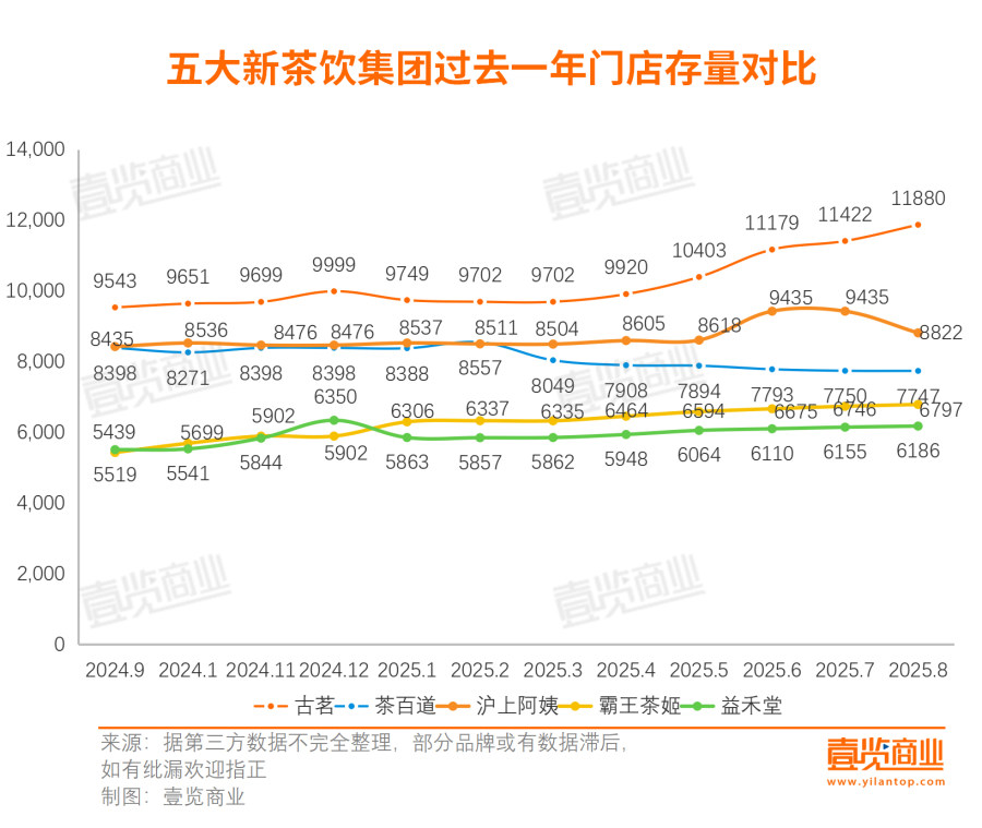 从新茶饮头部品牌现存门店量看,古茗过去一年一路走高,从9543家增至11880家,年增幅超过两千三百家,自5月突破万店后,仍保持快速上扬势头,显示出加盟需求与下沉市场的持续释放。