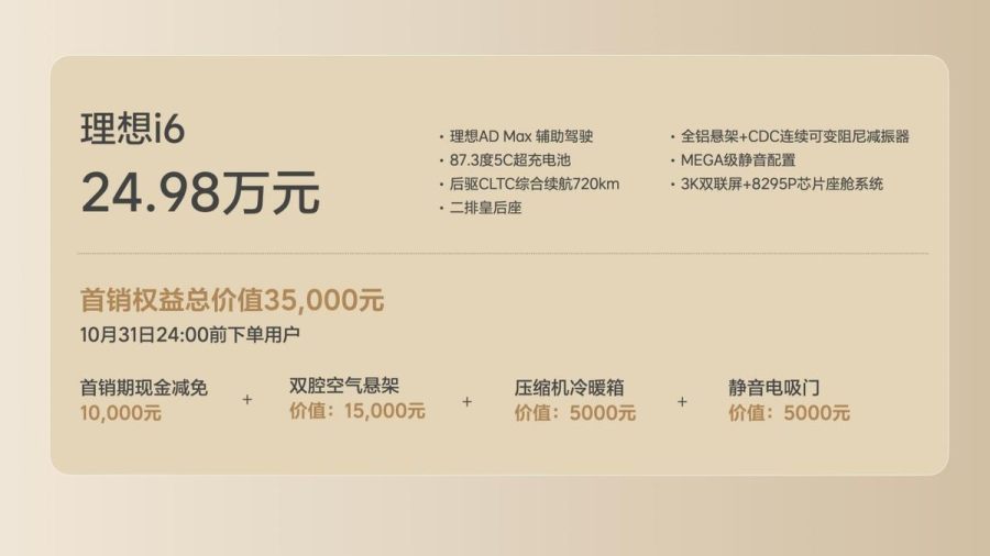 即日起,理想i6可以通过理想汽车官网或理想汽车App进行订购。2025年10月31日24:00前确认订购的理想i6用户,将享受10,000元的现金减免权益,以及双腔魔毯空气悬架、智能冷暖双用冰箱、全车静音电吸门的免费赠送权益,限时首销权益可与其他权益叠加使用。