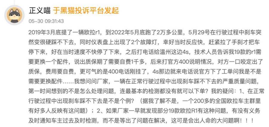比如,2022年5月30日,有车主反映,其在2019年提的一辆长城欧拉R1,于2022年5月29日“在行驶过程中刹车突然变很硬踩不下去,同时仪表盘上出现了2个故障灯”,险些酿成事故。