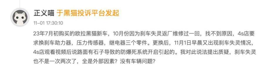 2023年11月1日,又有网友反映称,其在2023年7月初购买的欧拉黑猫新车,10月份因为刹车失灵返厂维修过一回,找不到原因,4S店要求换刹车助力器、压力传感器、继电器三个零件。