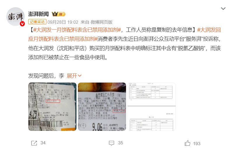 近日,据“澎湃新闻”报道,消费者李先生投诉称,他在大润发(沈阳和平店)购买的月饼配料表中明确标注其中含有“脱氢乙酸钠”,而该添加剂已被禁止在一些食品中使用。