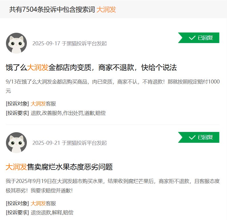 此外,黑猫投诉平台上,截至9月29日,有7504条投诉包含搜索词“大润发”。其中,多条涉及产品质量问题,如肉变质、收到腐烂水果、葡萄发霉变质、小麦粉中出现虫子等。