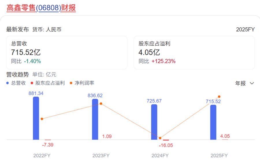 业绩表现最为直观。2022到2025财年,大润发母公司高鑫零售分别实现营收881.34亿元、836.62亿元、725.67亿元、715.52亿元;股东应占溢利分别为-7.39亿元、1.09亿元、-16.05亿元、4.05亿元。