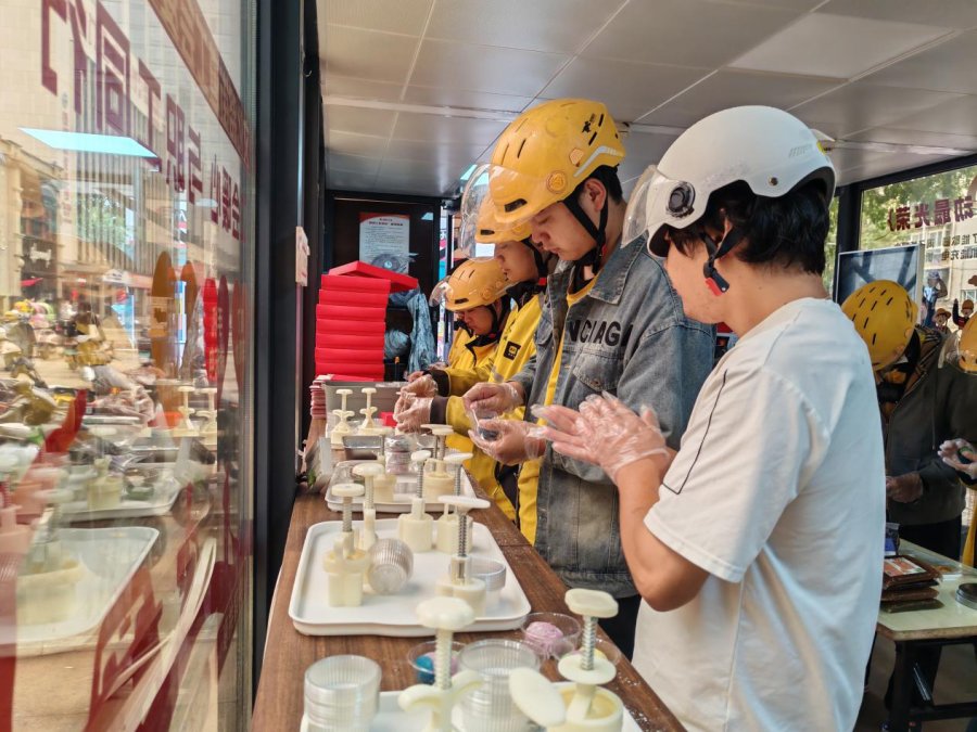 现场的小哥纷纷动手尝试,揉面、包馅、压模,动作从生疏到熟练,不一会儿,一个个形态精致、色彩清新的冰皮月饼便摆满桌面,大家互相展示成果,驿站内满是欢声笑语。
