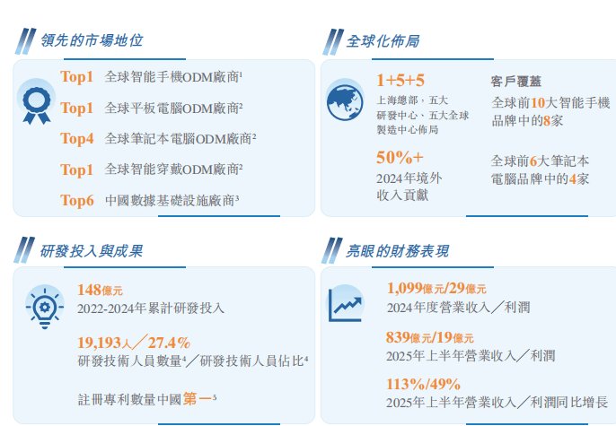 的智能手机ODM厂商;全球第一大的平板计算机ODM厂商和智能穿 戴ODM厂商;全球第四、中国内地第一大的笔记本计算机ODM厂商。