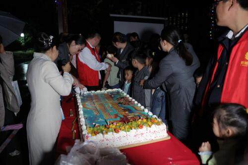 随着夜幕降临,活动渐入高潮。在温馨的灯光下,邻里们共同唱响团圆歌曲,分享象征团圆的中秋蛋糕,现场弥漫着甜蜜与温馨的氛围。