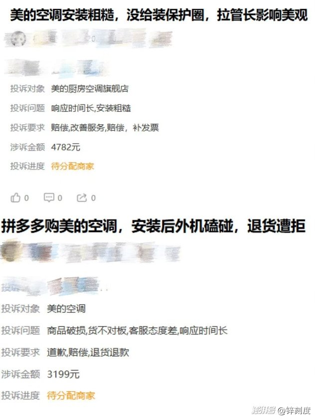 锌刻度从黑猫投诉平台观察到,关于美的空调的投诉高达8360条,其中有人提及自己购买的美的空调迟迟无人送货,后来在安装空调时也是坎坷重重;也有人说购买的美的空调刚使用就坏了,要求启动100天只换不修服务,也被反复推脱,没有得到积极的售后态度;又或者是安装空调十分粗糙、因安装不当造成外机损伤……涉及各方面的投诉问题诸多。
