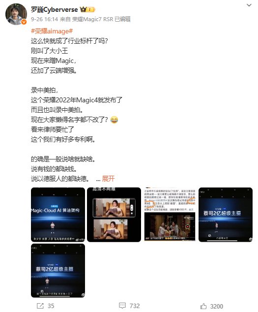据鞭牛士报道,9月26日,荣耀首席影像工程师罗巍通过社交平台公开质疑vivo即将发布的X300系列涉嫌功能抄袭,直指其“录中美拍”功能与荣耀2022年推出的Magic 4系列功能同名,引发手机行业对创新边界与知识产权的热议。