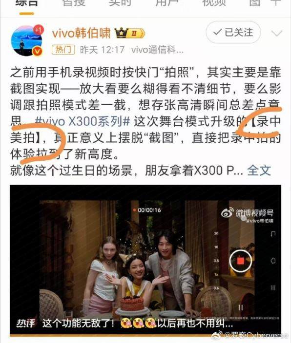 截至发稿,vivo 官方尚未对此事作出公开回应。据了解,vivo X300系列计划于10月13日正式发布,此次 “录中美拍” 功能被宣传为影像升级的核心亮点之一,主打视频录制与拍照同步优化的体验,与荣耀当年对该功能的定位高度相似。