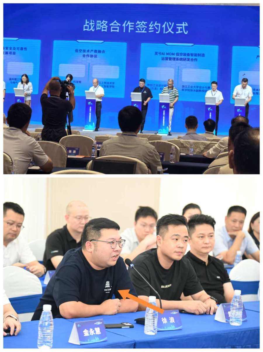 在众多参会企业中,甲易(浙江)科技有限公司格外亮眼。其研发的低空飞行器在展示厅吸引了大量关注,公司董事长徐浪展现出卓越的战略眼光与合作精神,现场与浙江工贸技术学院人工智能学院签署“低空技术产教融合合作协议”,搭建起企业实践与高校学术资源对接的桥梁,为产业人才培养和技术创新奠定基础。同时,徐浪还在“低空智能装备全产业链协同创新研讨会一对一对接会”上,积极与各方交流,为推动全产业链协同发展贡献力量。