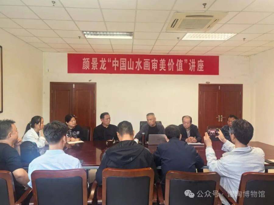 捐赠仪式后,颜景龙先生在馆陶博物馆会议室开展“山水画审美价值讲座”,20余名书画爱好者参加讲座。讲座上,颜景龙先生娓娓道来,将山水画创作与人类依水而居的习性联系,从中国自然环境讲起,阐述在人类发展进程中,自然山水的重要性以及在艺术创作中遵从自然、展示山川河流对人类审美的影响。颜景龙先生结合个人艺术理念和创作实践心得,剖析中国山水画的精神内涵,中国山水画的历史与今天,山水画自魏晋兴起,到隋唐逐渐独立,再经五代两宋发展完备且成熟,并走向辉煌,至此山水画占据了中国画的主流地位。指出中西方绘画各自具有的不同文化特征和美学趣味,山水画的鉴赏和评述应该在充分感受和理解中国传统的美学思想观念、审美经验以及文化和历史背景下进行。