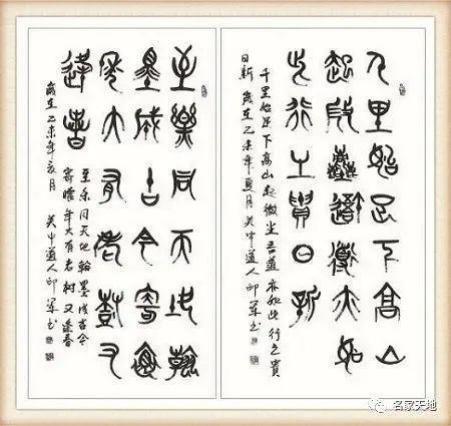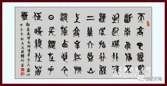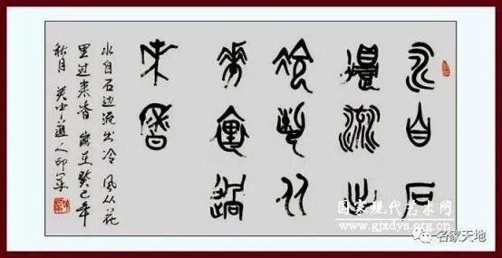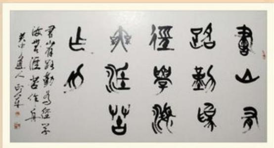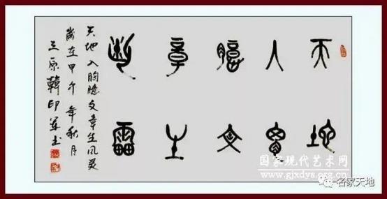 走进韩印军先生的书法作品世界,总是会有“奇观横空出世”的震撼感受。在一般人的印象里无论是石鼓文还是鸟虫篆,抑或是钟鼎铭文、毛公鼎、散氏盘等等文字形态都显得相当生疏,近乎没有什么印象。形且不知,何况书法审美。鉴于大众书法审美、专业书法创作对大篆这一区域的空白现象,韩印军先生是有着补充空白,带领人们一览大篆书法奇观、体现先秦文字奇绝的发心。这种文化发心的恒久与坚持,让他从一位书法家拥有了文化家、文字学者、文字考古专家的多重身份历练!