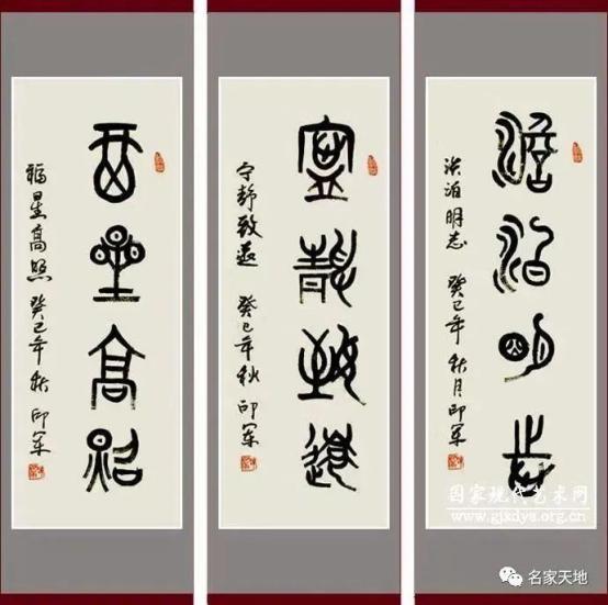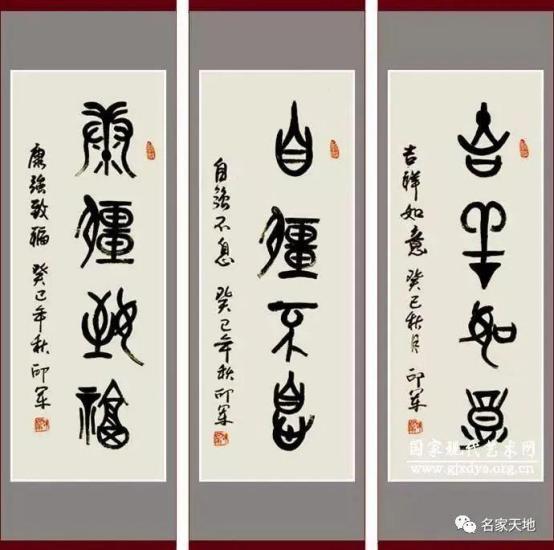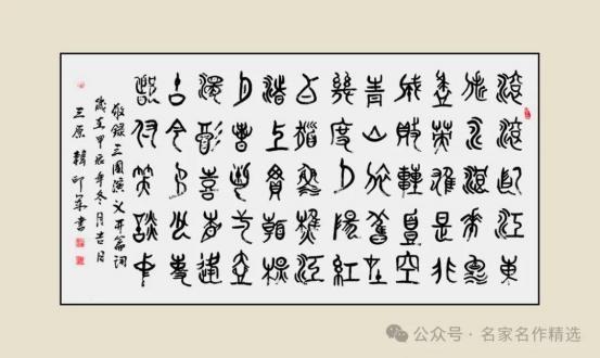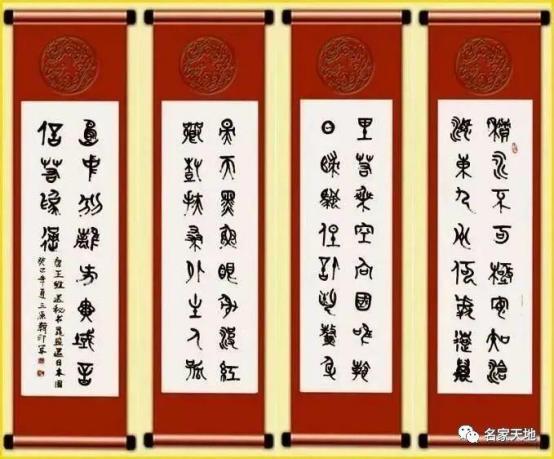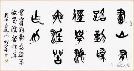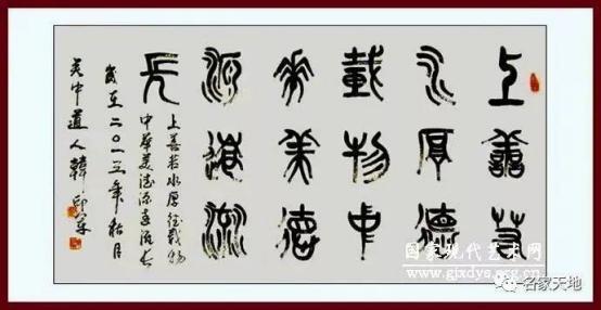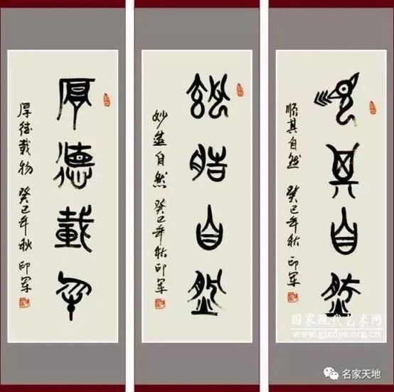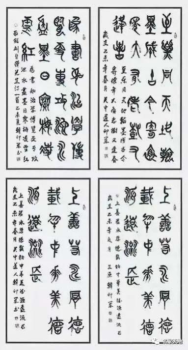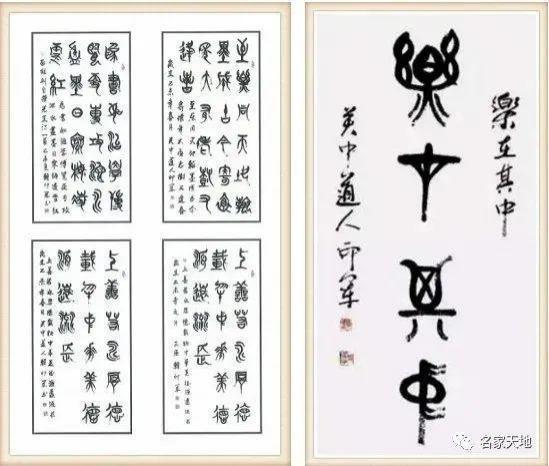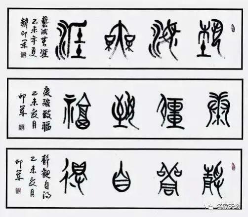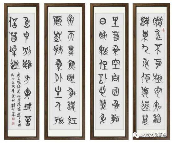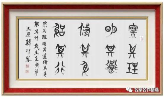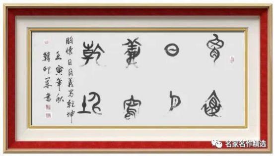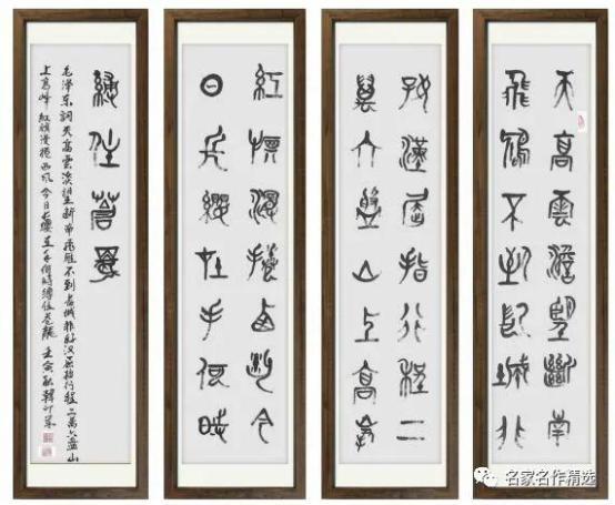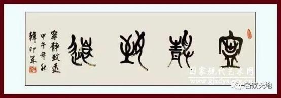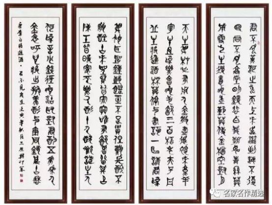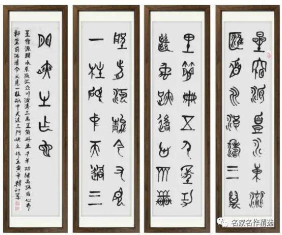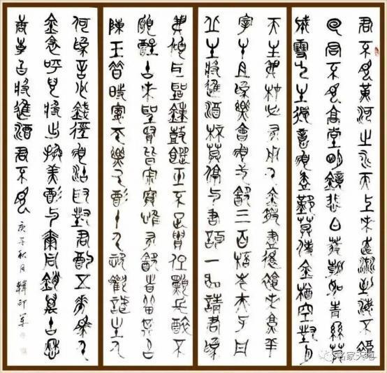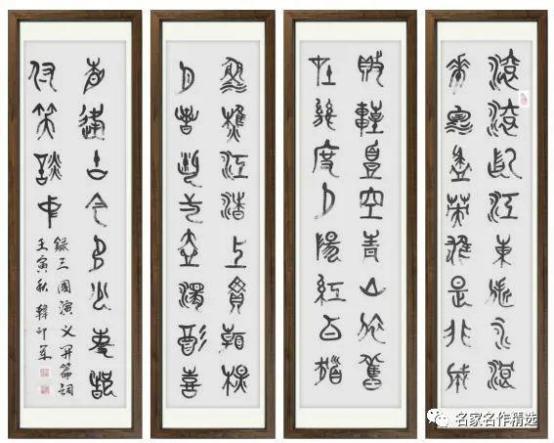 统筹大篆文化与艺术的研究新成果。韩印军无论是写中堂,还是写四屏,他的大篆书法已经成为非遗文化的一块金字招牌!成为当代书坛可以与远古奇迹对话的桥梁,这是书法的功夫,也是文化的功勋。笔里有墨,墨里有笔,一件件大篆作品可以贯通今古,让我们在今天通过他的笔墨去聆听曾经天粟雨的声音。韩印军先生的大篆创作,如一道文化闪电,照亮了当代书法的一个盲点,成为艺术与学术的双璧珍品。一一观览这些超乎寻常的笔墨作品,必然会对韩印军先生研习书法文化历史的努力大为尊敬,他执笔纵墨精研篆籀,挖掘书法文化龙脉之根,借古开今让书法精髓古今相续!