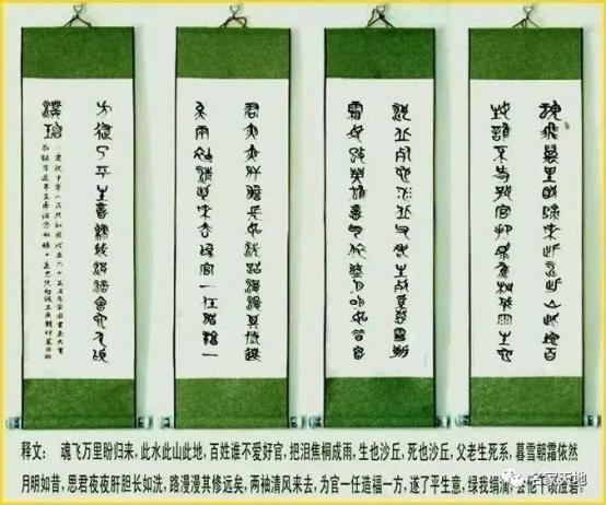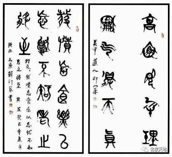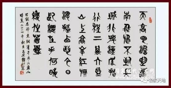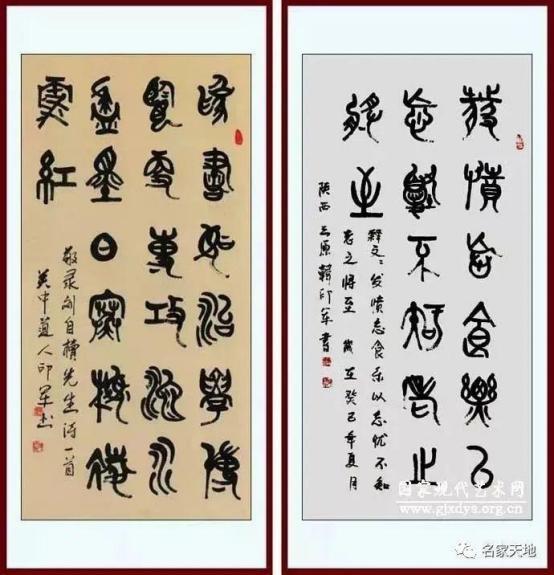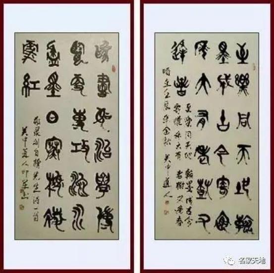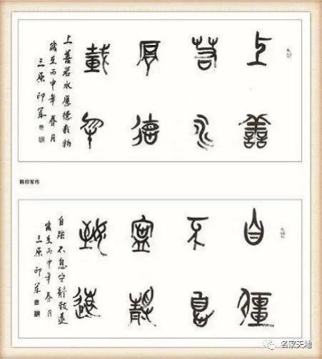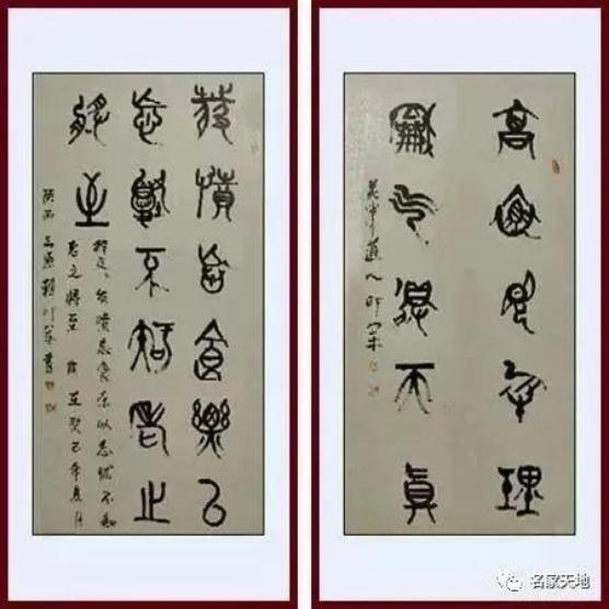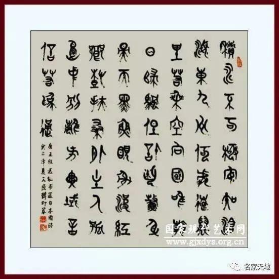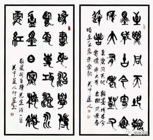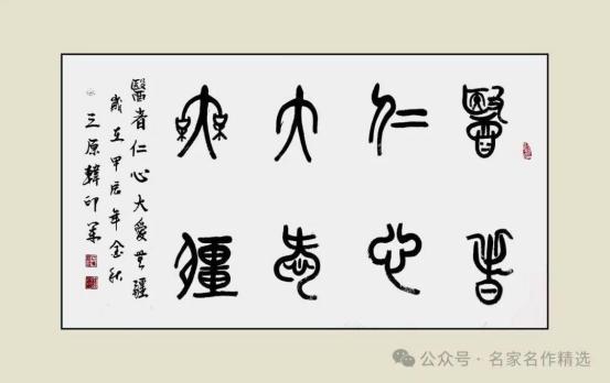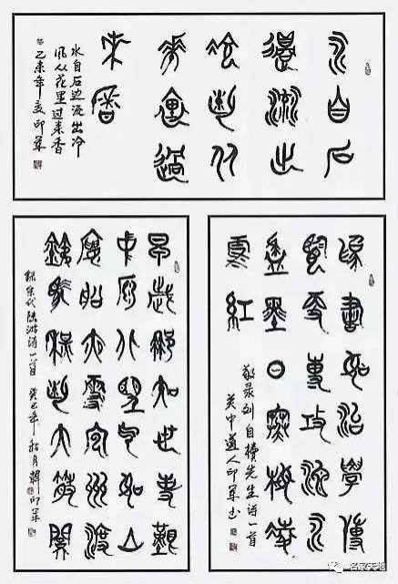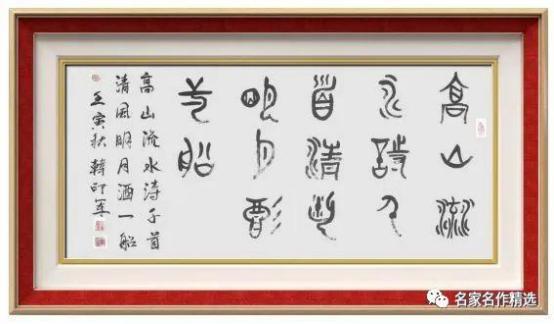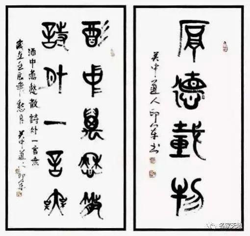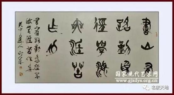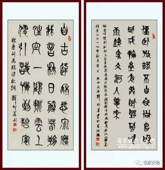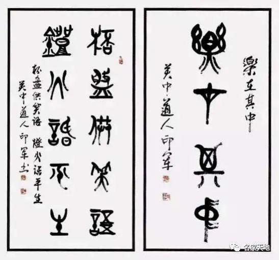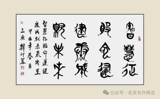 统筹大篆文化与艺术的研究新成果。韩印军无论是写中堂,还是写四屏,他的大篆书法已经成为非遗文化的一块金字招牌!成为当代书坛可以与远古奇迹对话的桥梁,这是书法的功夫,也是文化的功勋。笔里有墨,墨里有笔,一件件大篆作品可以贯通今古,让我们在今天通过他的笔墨去聆听曾经天粟雨的声音。韩印军先生的大篆创作,如一道文化闪电,照亮了当代书法的一个盲点,成为艺术与学术的双璧珍品。一一观览这些超乎寻常的笔墨作品,必然会对韩印军先生研习书法文化历史的努力大为尊敬,他执笔纵墨精研篆籀,挖掘书法文化龙脉之根,借古开今让书法精髓古今相续!