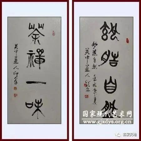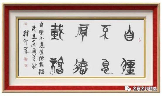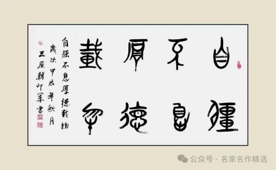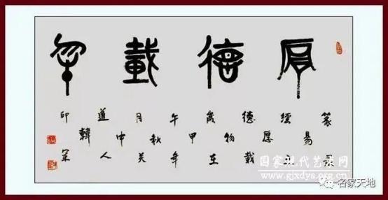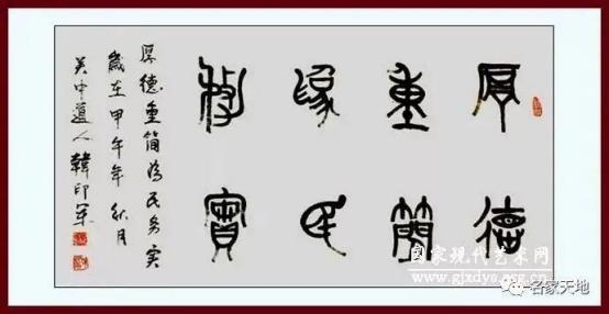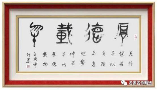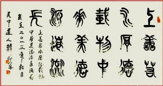 一是在艺术构思上以“气”贯之。从而带给读者以内容与形式的整饬美。“气”是中国传统哲学中标示客观存在的重要范畴,后来被引入到文学、艺术的各个艺术领域。就形式美而言,韩印军的作品“气脉”贯通,断处“形断而气聚”;连处“距密而气畅”,字里行间流荡着逶迤起伏的动感。例如他的大篆作品《闻鸡起舞》,取金文形意,而在气韵上追求“时和气润”,放而有度,收而不拘,鸡鸣人舞,浑然一体。“字有骨肉筋血,以气充之,精神乃出。”(清姚配中语)就内容美而言,他的作品大力弘扬的书法艺术的“载道”精神。孙过庭在《书谱》中指出:“假合众妙攸归,务存骨气”,韩印军对此有着自觉的领悟和把握。我们从《吉祥如意》感受到儒家“和实相生”的中和之气,从《有容乃大,无欲则刚》中领略了秦人“海纳百川” 的包容之气,“壁立千仞”的刚烈之气;从《茶禅一味》中品读佛家绝尘弃俗的宁静之气,道家的无为之气;从《慎独》中内省修为的“求己”之气。特别是《上善若水厚德载物》,以丰富而又灵动的线条语言、凝重朴厚的笔触,浑然大气的结构,将中华民族尚礼、重德、和谐、中正的人文精神表现得隽永而又庄重。诚如清人王船山所说:“道者,器之道;器者,道之器也”,线条、笔墨都不过是一种特殊的话语系统,是为“载道”服务的。韩印军“大篆”作品充分说明,“高韵、深情、坚质、浩气缺一不可以为书”,他作品的生机来自于赳赳大秦的文化气质、烈烈大汉的文化气韵、勃勃盛唐的文化气势,也凝聚着他个人重修为的文化气节。