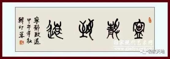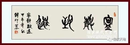 二是在艺术节奏上以“韵”统之。北宋范温在《潜溪诗眼》中指出:“凡事既尽其美,必有其韵,韵苟不生,必亡其美。”认为韵能够“包括众妙,经纬万善”。韵为作品带来的是生机、是高雅,是喧响,是旷远,它是一种处在动态中的节奏感和旋律感。从这个意义上说,书法就是一种无声的韵律。书法是线条艺术,它只有在带给读者“婉而通”的节奏美、旋律美时,才算实现了完整的审美表达,故而孙过庭在《书谱》中特别强调“篆尚婉而通。”韩印军的大篆作品处处彰显出这种美学追求。如《至乐同天地》中,其落笔,重求千钧,轻仪蝉翼,体现出对运笔过程中提按、绞转的辩证统一。其墨色,浓如烟云,淡如岚霭,有“青山淡远而含靥”的画意风韵;其枯润,枯时飞白散雪,润时酣畅淋漓。他注重开笔时求湿润,给人以丰腴润泽之感;收笔求枯笔,于苍劲古雅中求朴拙老辣;再从布局看,体现出破与立的彼此呼应,险与平的相互制衡。如“地”的简约与“翰”的蕃绚;“树”的枝繁叶茂与“又”的洒脱飘逸,都使得这幅作品富含抑扬顿挫的乐感,透着起伏跌宕的诗性,正所谓“情韵深远”、“气韵深长”、“风韵婉转”。还要指出,线条语言在韩印军的美学创造中占有重要地位,不惟灵动丰富,而且极具张力和弹性,《宁静致远》对于线条形式美和内涵美的结合具有一种审美的自觉。