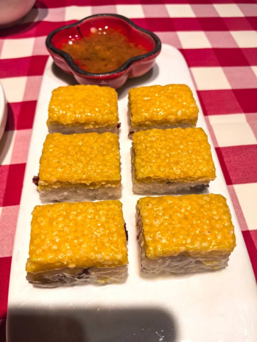 但今天的黄米凉糕,只是比常温稍微低温一些,并且里面的“米粒”粘性大但很松散,确实不像是冻过。